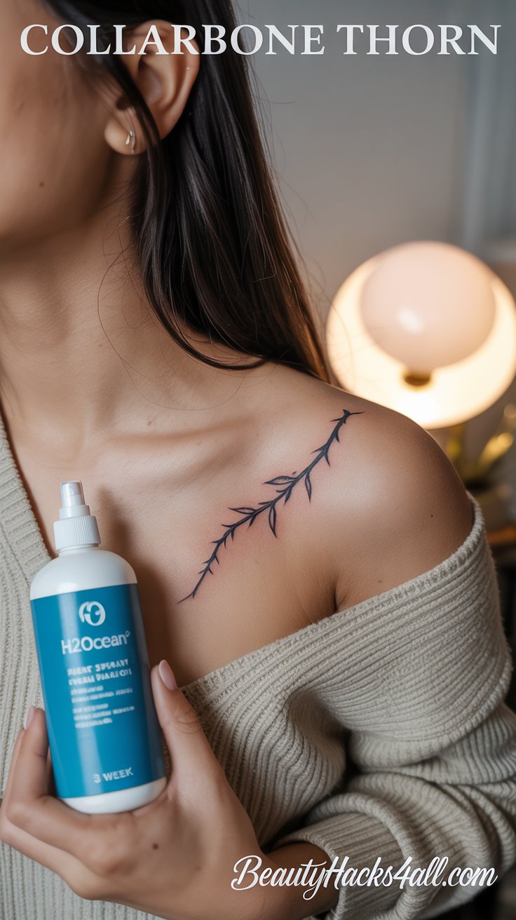 Collarbone Thorn Outline: A simple, fine-line outline of a rose stem with a single thorn, placed along the collarbone. It strikes the perfect balance between soft romance and a touch of resilient edge.