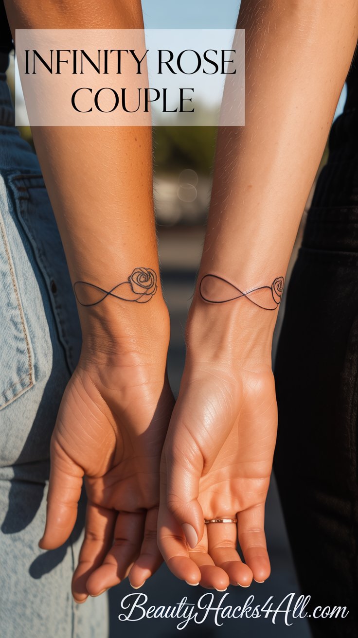 The Infinity Rose Loop: Two simplified rose outlines that interlock like an infinity symbol, inked on each partner’s wrist. They stand alone beautifully but symbolize an interconnected bond.