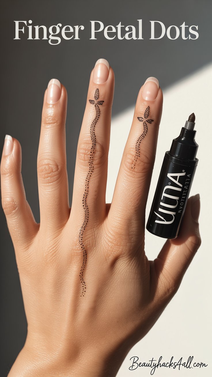 Finger Petal Dots: Three to five tiny dots placed along a finger bone, suggesting a falling petal or a minimalist constellation. These can naturally fade over time, making them a poetic choice for a moment you want to remember but not necessarily forever.