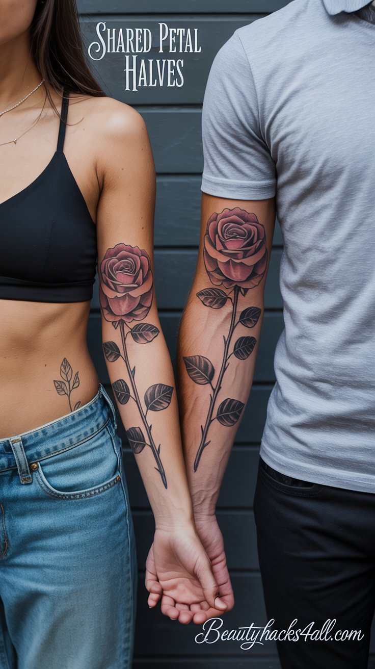 Shared Petal Halves: One partner gets the left half of a rose on their ribcage or forearm; the other gets the right. The design is only complete when you stand side-by-side.
