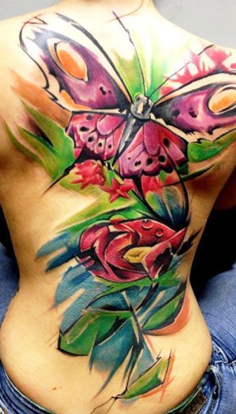 - This specific tattoo has a very powerful meaning which is expressed by the colorfulness. The flowers and the butterflies connect and make a whole, which means purity and freedom.