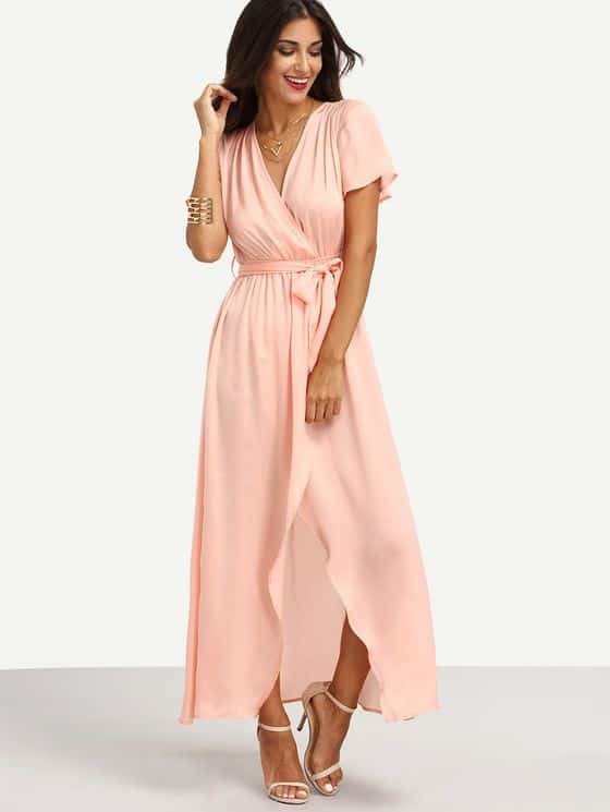 1. Bright pink long dress with a V neck and a lacer.2.Grey flowy sparkly midi dress |
