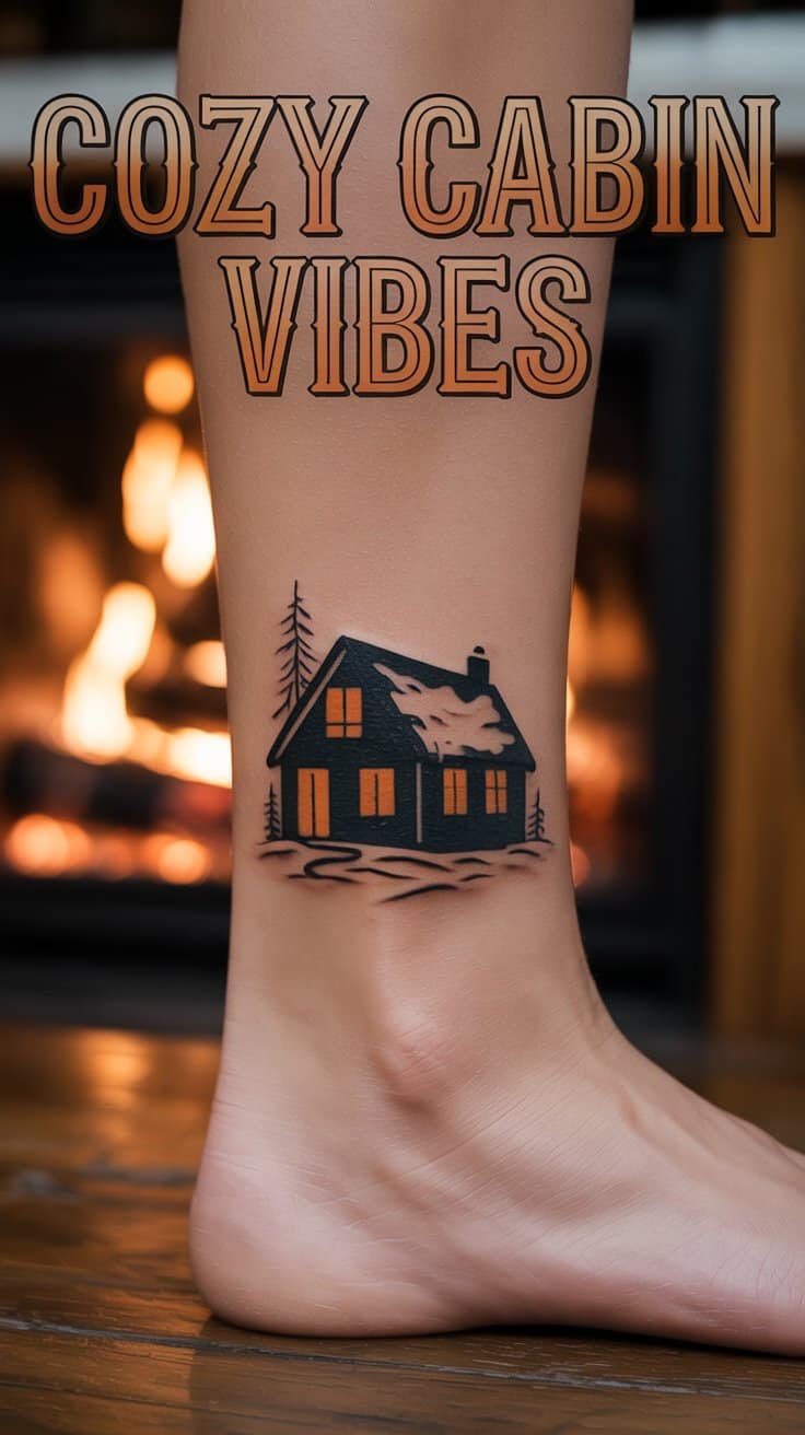 Mini cabin silhouettes with chimney smoke on ankles—2-inch nostalgia hits, fireplaces crackle inner arms cozy. Snow-dusted roofs nod holidays quietly. Watercolor warms without bulk. Symbolize home amid hustle. Calf pairs boots perfectly. Session under an hour. Heart heart forever.