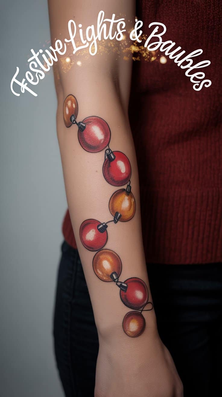 Picture lights trailing your forearm like backyard strings—soft glow captured in faded reds and golds, 5 inches of cozy memory. Watercolor keeps it dreamy; black line makes it crisp for daily wear. Bauble stacks dangle from ribs like earrings, three glossy orbs with shine pops, evoking shared laughs over cocoa.