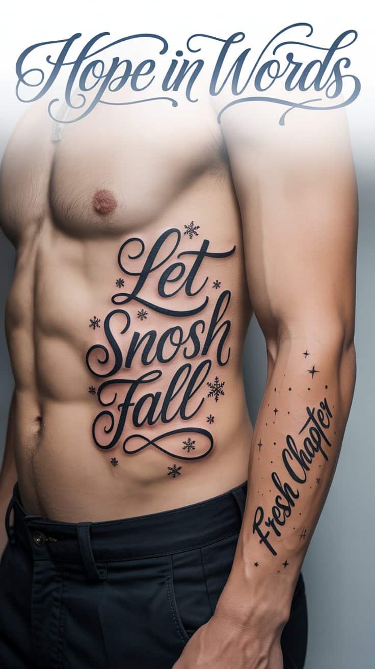 “Let snow fall” arcs ribs with flake accents—4-inch optimism curve, handwritten soft for touch. “Fresh chapter” dots forearms starry, blending cheer with quiet drive. Black ensures reads clear; initials personalize.
