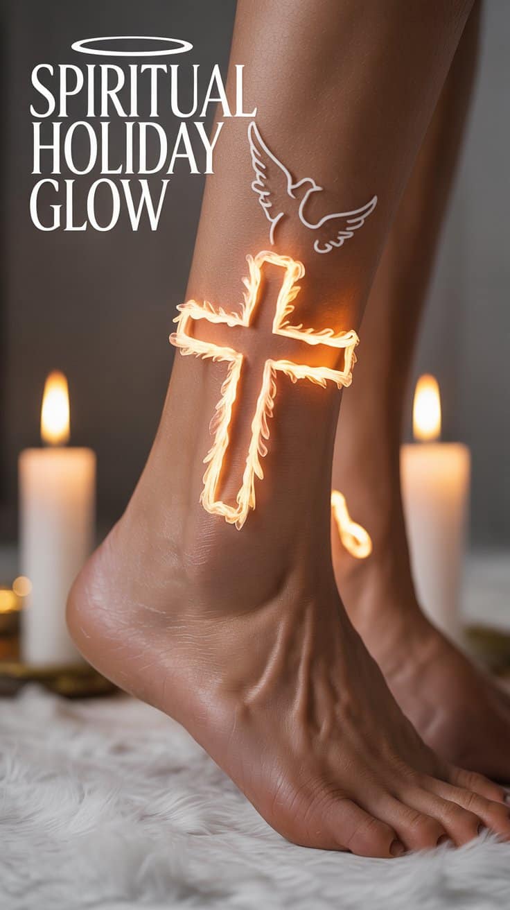 Wreathed crosses ankle-low glow faith—outlines with flame hints. Winged outlines collar grace eternal. Doves loop peace simply. Short sits, subtle power. Spiritual anchors like candle nubs or star halos honor roots quietly.