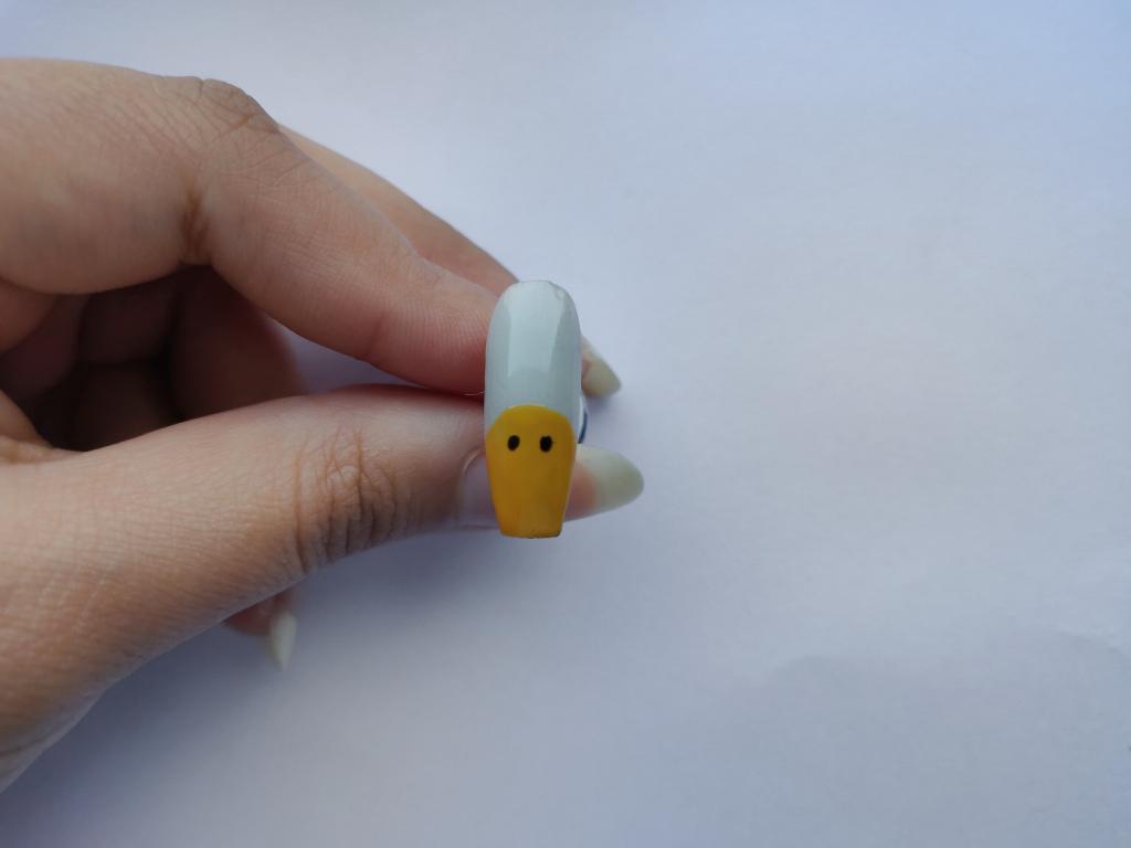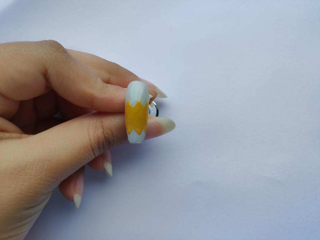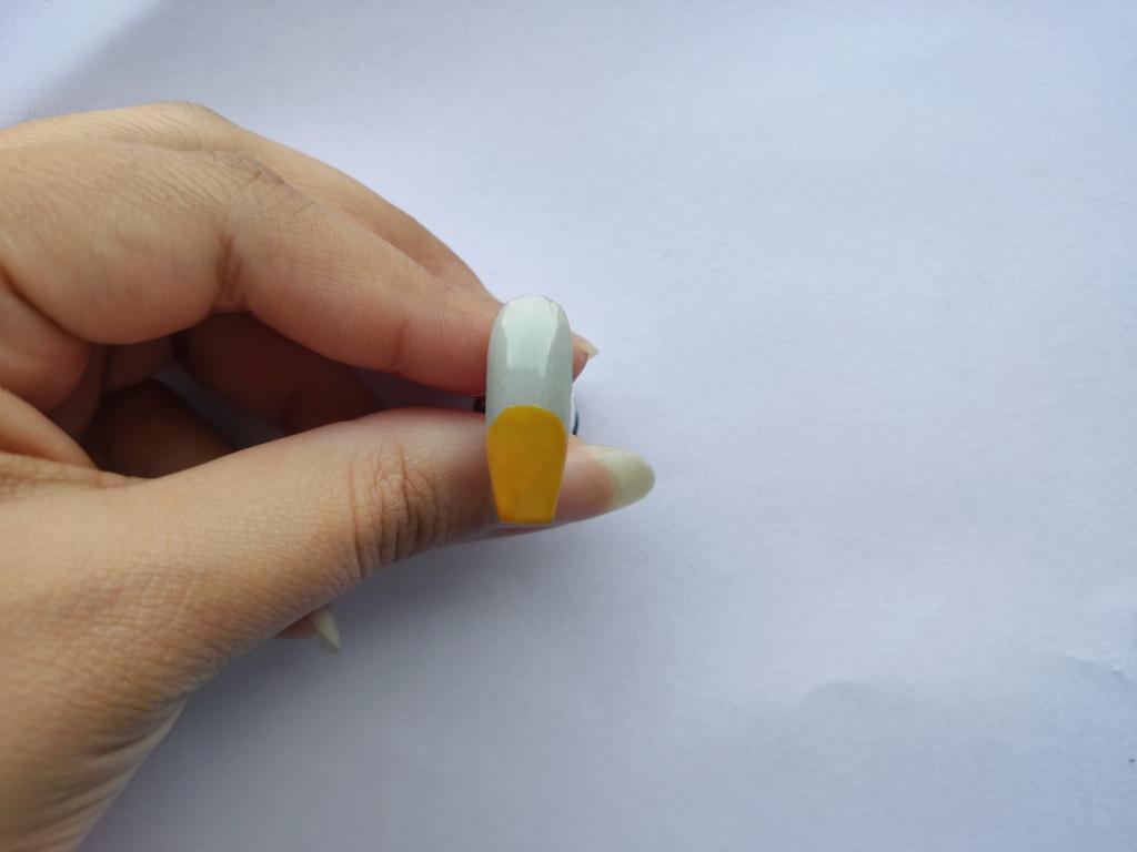 Take the yellow shade or mustard color gel polish or gel paint. We are making Yellow cute chick. Draw a half-circle on the tip of your nail.