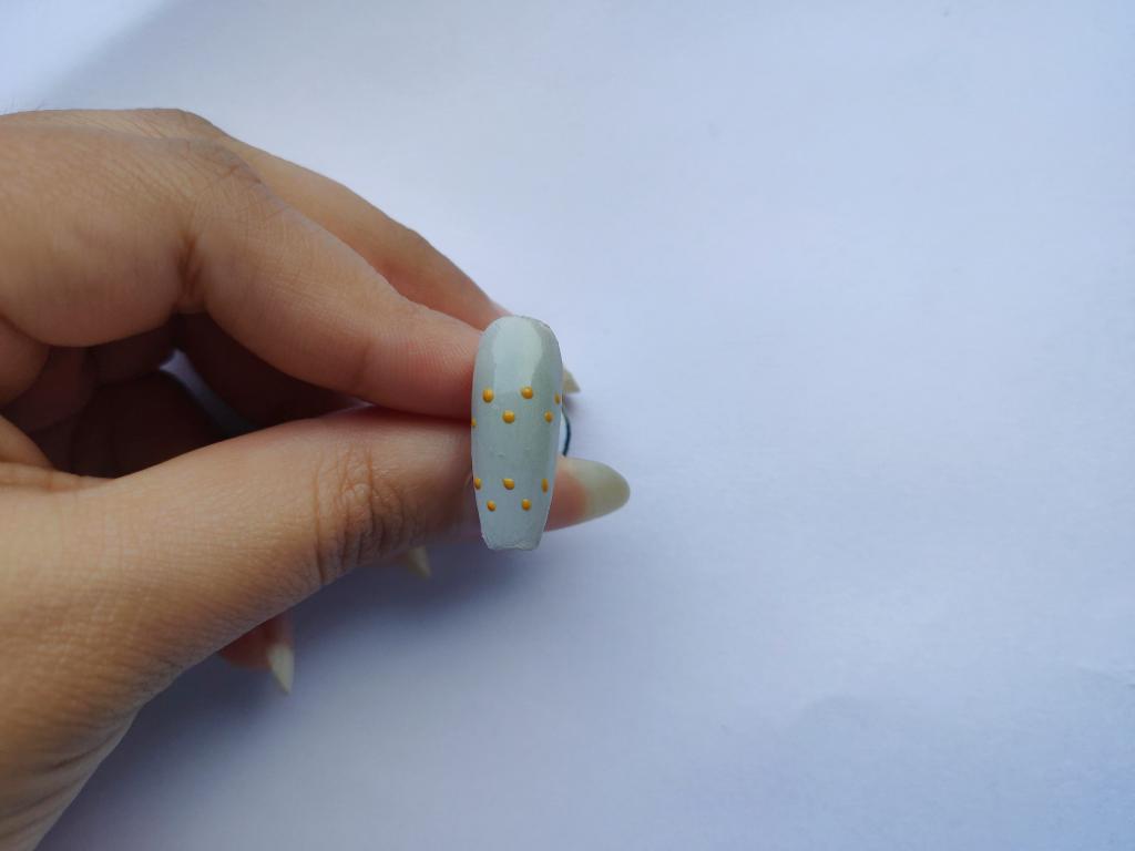 Now use a small dotting tool and place some small dots on your nails. I am using the same yellow color you can use this too. Or just go for the one that suits you the best.