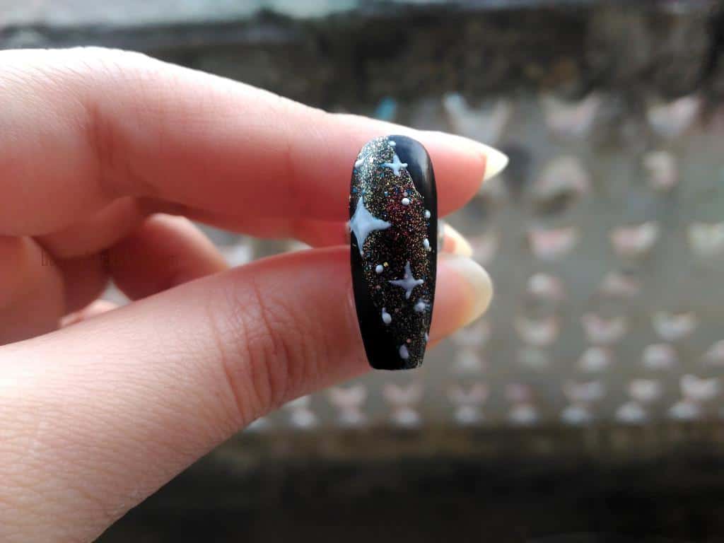 Use the glitters of different shame and size also. Bigger will represent the closest stars and small will be the farther. I found this technique is the simplest way to get galaxy nails.