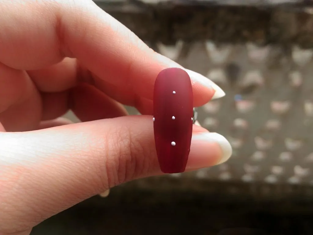 Make one dot in the middle of your nail and then four around it. You have to make a big plus on your nail. Make dots where you want your plus (+) to end.