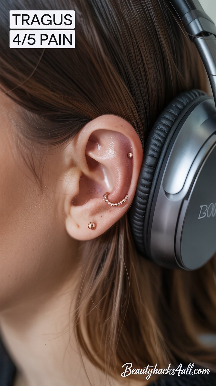 “How much does it really hurt?” Pain is subjective, but a lobe is a quick pinch (1/5), a helix feels like a sharp pinch and pressure (3/5), and a tragus is a more intense, dull pressure (4/5). The anxiety is often worse than the actual event!