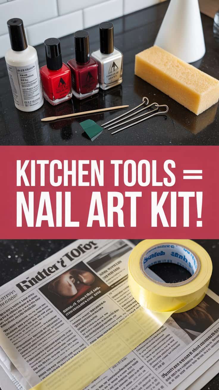 “Nail art doesn’t need a fancy kit!” Grab clear base coat + top coat, red/white/gold polish (old bottles work!), glitter if you have it. Kitchen heroes: toothpick (dots + lines), Scotch tape (perfect stripes), bobby pin (tiny details).