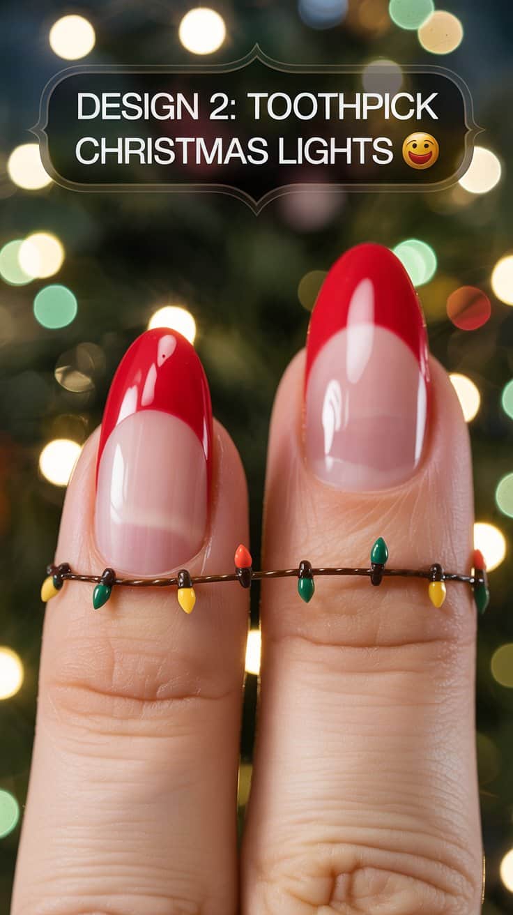 Clean toothpick, dip in red polish—dot 4-5 “bulbs” along wire. Repeat with green/yellow on the other nail. Slightly overlap dots for realism. Use the toothpick tip to nudge if needed. Top coat seals + adds glassy shine.