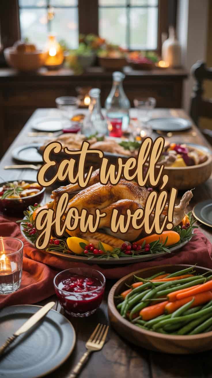 Did you know your dinner table can help your skin glow? Favor protein-rich turkey, vitamin-packed cranberries, and antioxidant-rich veggies, while keeping processed sugars and heavy gravies in check.