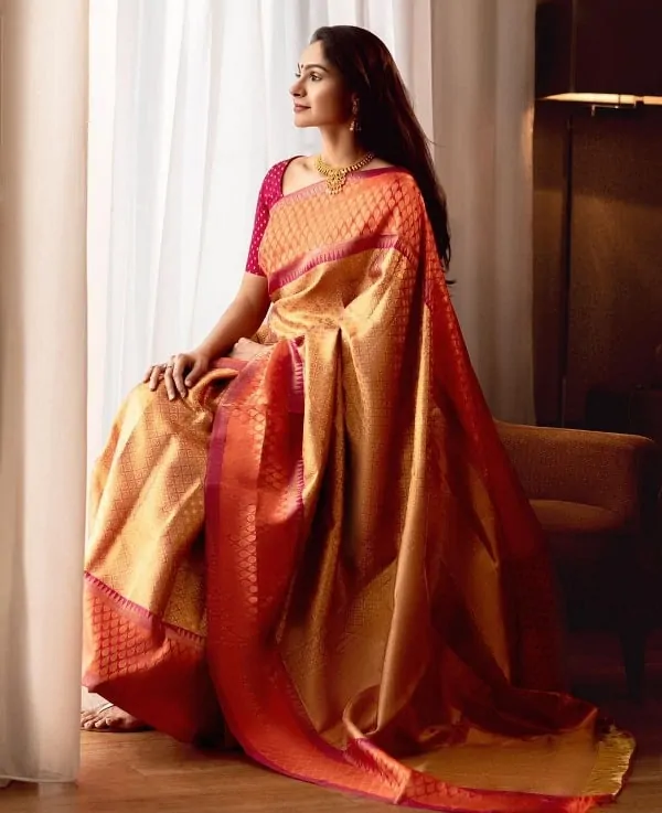 This is a saree which gives you a special feeling that no one can deny. You can see the perfect blend of art, tradition, and fashion in this Saree. I personally feel like this saree gives a simple but royal look.