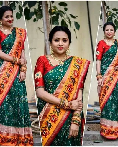 This Saree is also a double weaved Ikat made in Patan, Rajasthan. Patola silk sarees are very expensive sarees worn by Royal families and celebrities for occasions.